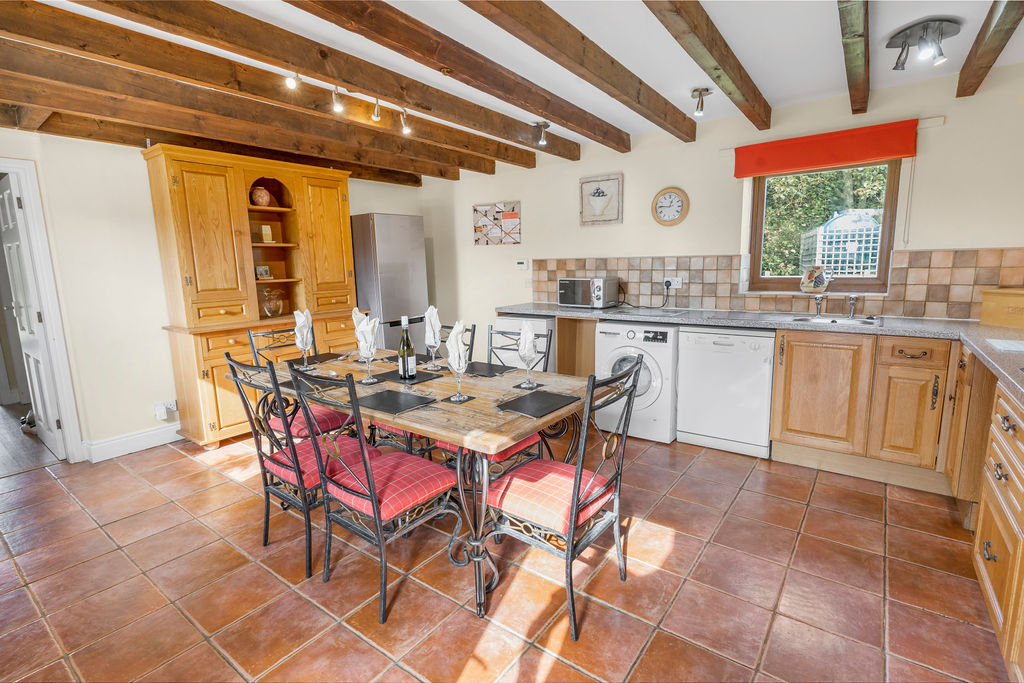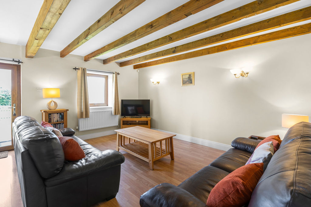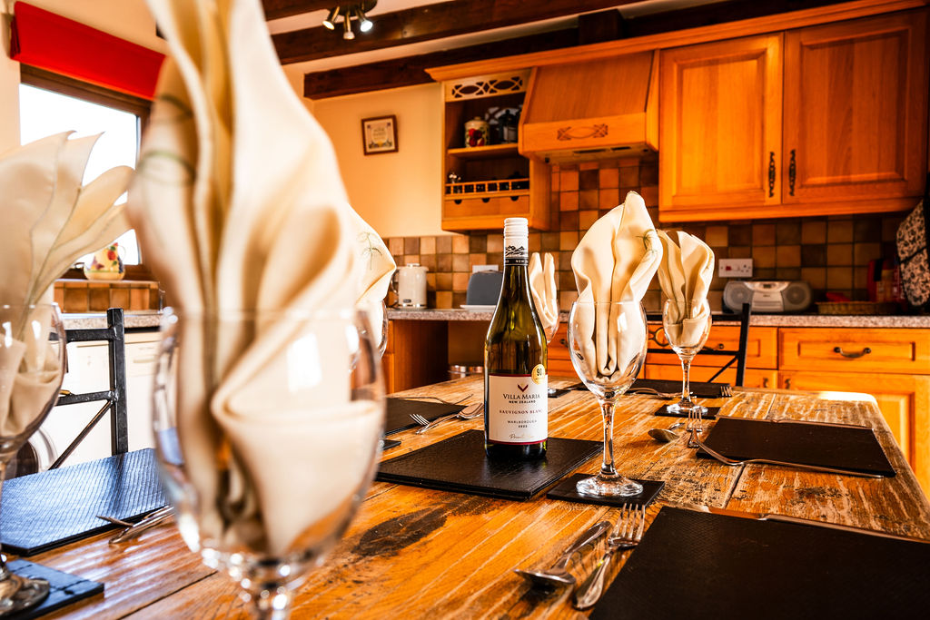 Large farmhouse style kitchen with large centre table and chairs. The kitchen includes dishwasher, fridge, freezer, oven, microwave, and washer, The Living room has french doors opening onto the garden, patio and hot tub. The living room has a flat screen smart tv and leather suite. Harvest cottage has free wifi, heated with central heating, and all on one level.